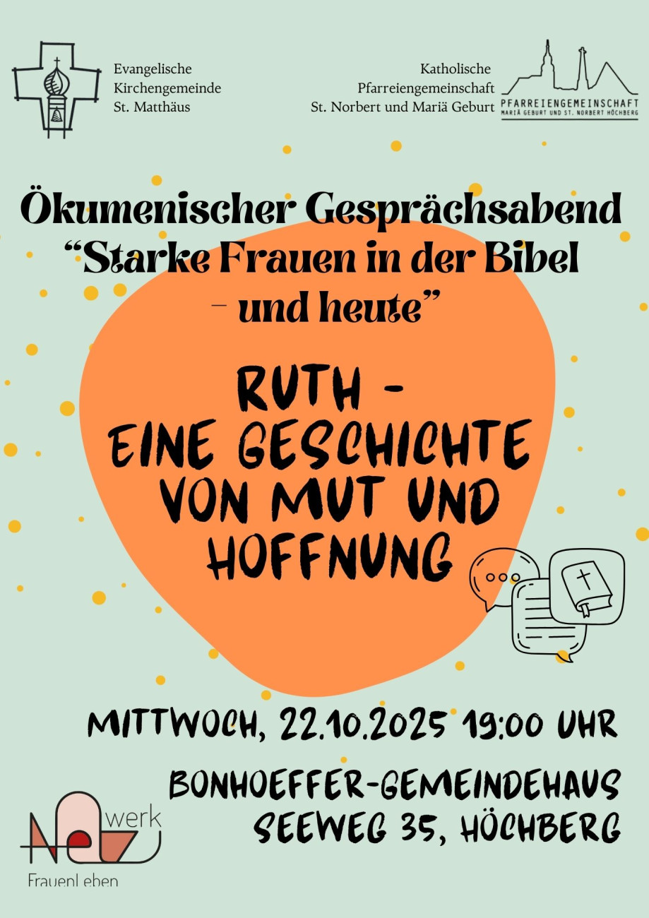 Gemeinsam wollen wir der Geschichte von Ruth nachspüren, über „starke Frauen“ damals und heute ins Gespräch kommen, und Raum schaffen für Austausch, Nachdenken – und vor allem persönliche Begegnung.