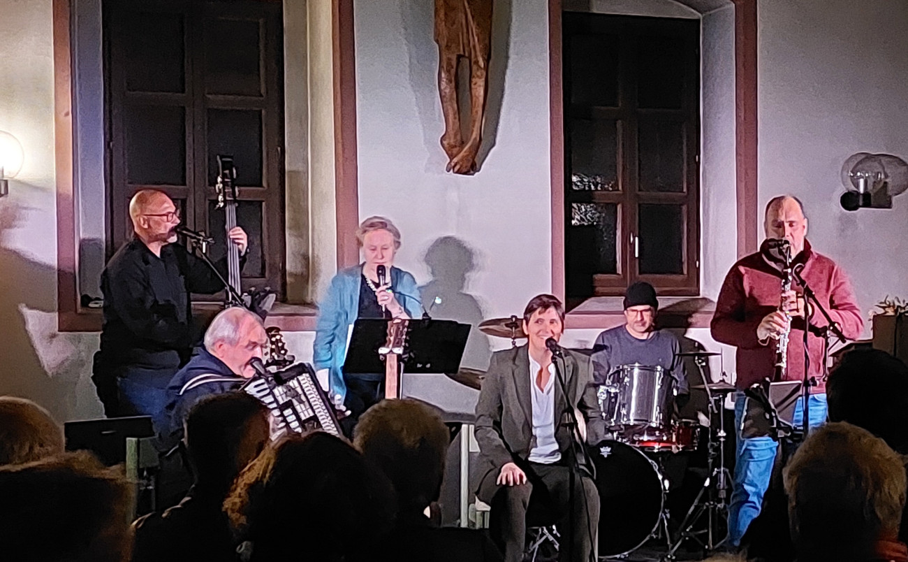 Im ersten Teil präsentierte die Band vertonte Texte von Hedwig und Franziska Lachmann aus ihrer neuen CD. Poetische Bilder, fein verwoben mit den typischen Klezmerklängen, schufen eine Atmosphäre voller Tiefe und Melancholie. Im zweiten Teil folgte ein temperamentvolles „Best of Klezmer“-Programm: das von der Lebensfreude jiddischer Musik geprägt war und die Zuhörenden kaum auf den Bänken hielten.
